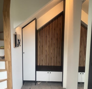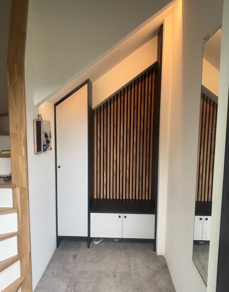 Zabudowa z drewnianymi lamelami: Ten projekt to kwintesencja nowoczesnego designu. Eleganckie lamele tworzą efektowną ściankę dekoracyjną, która przyciąga wzrok i nadaje wnętrzu ciepłego, naturalnego charakteru. Połączenie ich z szafą w matowej bieli i pojemną szafką na buty pod ławką to idealny sposób na zorganizowanie przestrzeni w korytarzu. Całość jest harmonijna, a zarazem niezwykle funkcjonalna.