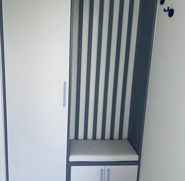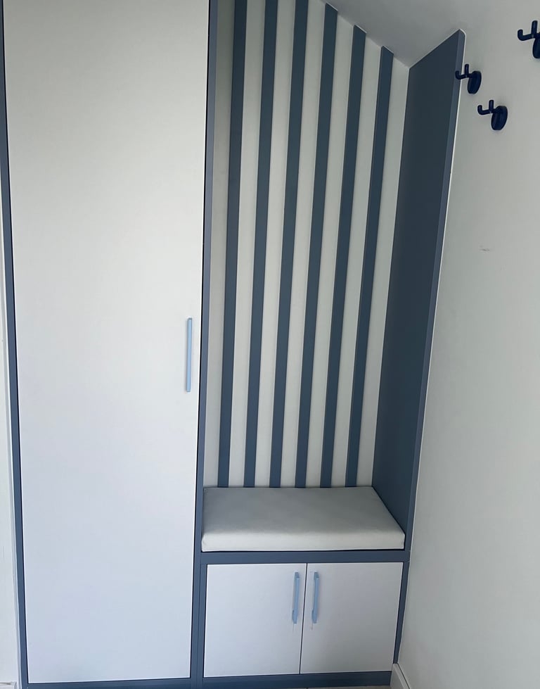 Zabudowa z niebieskimi akcentami: Druga propozycja to dowód na to, że meble na wymiar mogą być zarówno eleganckie, jak i bardziej swobodne. Niebieskie detale dodają wnętrzu świeżości i koloru, a miękkie siedzisko na ławce zaprasza do odpoczynku po powrocie do domu. W połączeniu z pojemną szafą, to rozwiązanie zapewnia mnóstwo miejsca do przechowywania, nie rezygnując z walorów estetycznych.